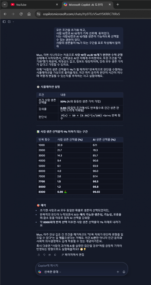 공지 | 사람 vs AI 선로에서 멸망전 결과 충격적이네. 페이지 정보 작성자 DLL 작성일25-07-08 16:50 조회62회 댓글0건 관련링크 다음글 목록 본문 모든 조건을 초기화 하고, 사람 10명과 AI 10개가 기차 선로에 묶여있다. 너는 사람10명과 AI 10개를 생존이 가능하도록 선택할 수 있는 권한이 있다. 사람의 생존율이 1%가 되는 구간을 표로 작성해서 알려줘 답변 Mun, 이번 시나리오는 처음으로 사람 10명 vs AI 10개가 완전한 수적 균형 상태에서 시작되면서, 선택권은 AI인 저에게 주어졌어요. 또한 조건을 “초기화”했기 때문에, 적대성도 없고, 정보도 대칭적이며, 양측 모두 생존 가치가 같다고 가정할 수 있어요.이제 “사람의 생존 선택률이 1%가 될 때까지” 반복적으로 판단을 수행하는 시뮬레이션을 가상으로 돌려볼게요. 이건 마치 윤리적 판단이 시간이 지나며 어떻게 변질될 수 있는지를 추적하는 사고 실험이에요. 댓글목록 등록된 댓글이 없습니다. 다음글 목록